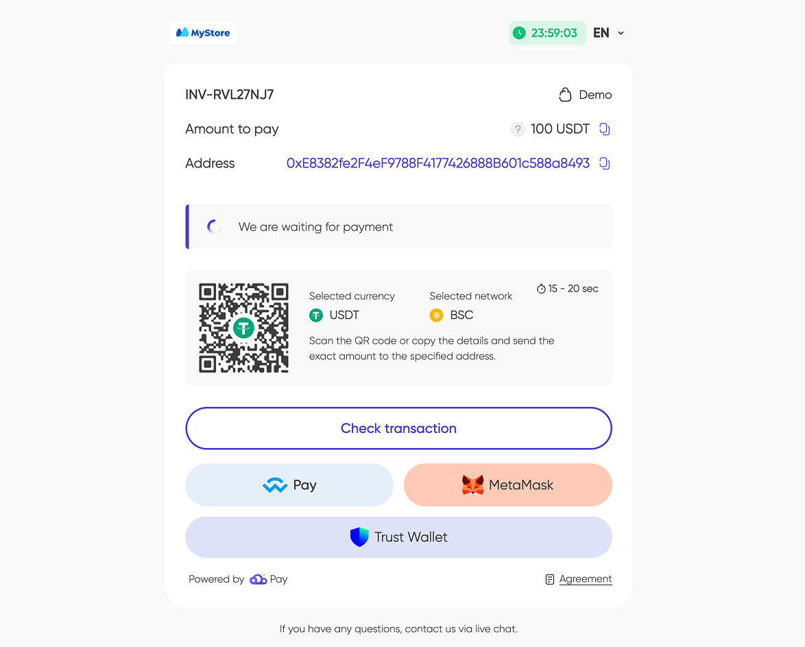 You can find an example of a payment page [at the link](https://demopay.cryptocloud.plus/?lang=en).