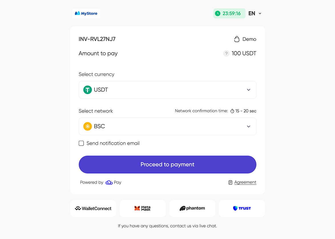 * Compatibility. Compatible with all cryptocurrency wallets, which provides flexibility for users. Additionally, to simplify the process, fast payments are available via browser-based Web3 wallets (MetaMask, Trust Wallet, etc.) and WalletConnect.
