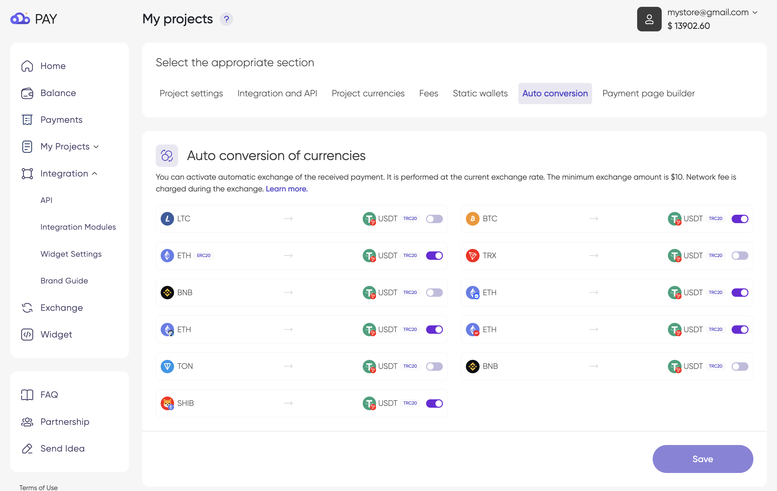 When enabled, incoming payments will be automatically converted into USDT TRC20. The following conversion directions are available for automatic exchange: