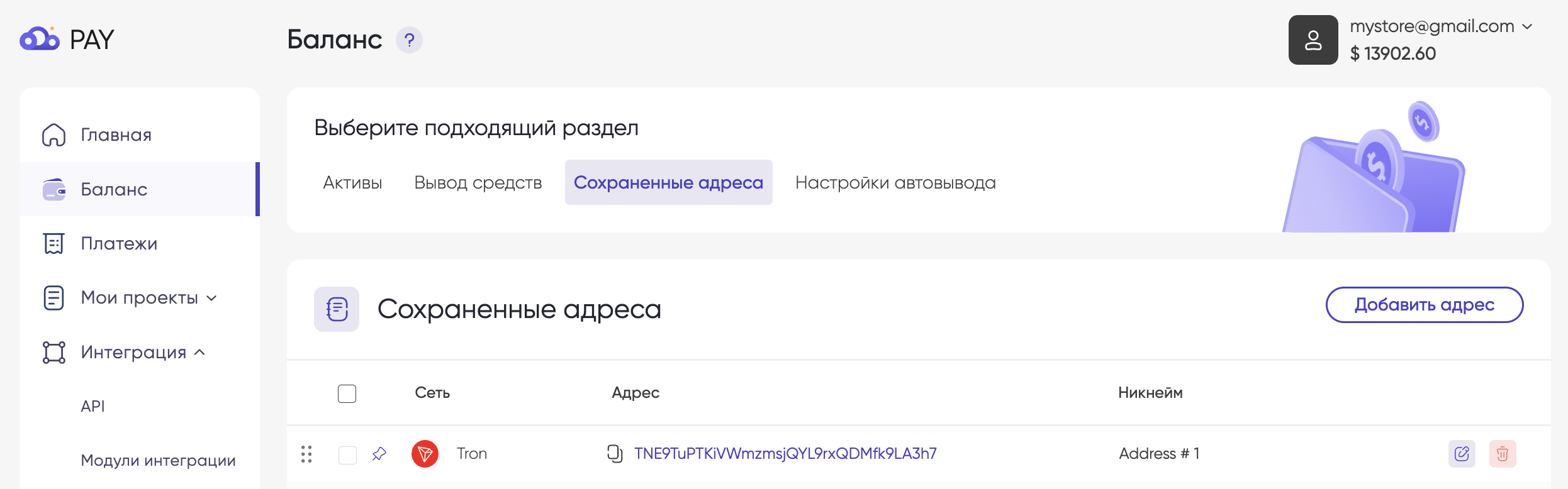 1. В разделе «Баланс» перейдите в «Сохраненные адреса»